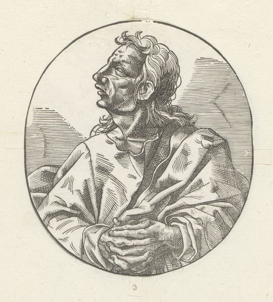 Curator: Looking at "Human Mask Looking to the Left within a Circle" by Gaetano Piccini, dating back to 1727 and housed here at the Metropolitan Museum of Art, my immediate reaction is to examine the use of line. There’s a deliberate, almost academic precision in the rendering of this profile. Editor: Yes, its immediate impact is one of caricature. It exaggerates and deforms; the very nature of a 'mask' demands that it's separate from the actual human being and also the context in which it has been made. This doesn't quite achieve 'high art', for me at least, and leans towards 'craft' for a very different purpose, one perhaps of production and making, that would eventually involve labour and materiality. Curator: That is a fair point. The formal repetition of those strong diagonal lines mimics texture, creating volume, defining form in this two-dimensional space. Observe the deployment of line to delineate the contours of the nose or the furrowed brow – how line acts as both structure and surface, and creates an optical sense of reality. The Baroque use of light and shade gives a solidity to this 'mask' of humanity, so even within its circular frame, one is conscious of the tension of shape and composition. Editor: Exactly, and the choice of materials speaks to that. Pen and ink drawing in this period – it was not necessarily seen as precious in itself. It’s interesting to ponder what it could have been intended for originally: studies, prints, or preparations for other projects. How might these means of production have influenced the design to either celebrate or resist the elite circles? Curator: And that's where, structurally, the composition fascinates, I keep returning to the tension within the rendering. Is this study about capturing a universal human condition, an individual study? Or is this "mask" really something commenting about external impressions. Is it an idea rather than observation. Editor: Perhaps in our engagement we are only discussing the semiotics in a capitalist society. As we gaze upon it, the means of production are forgotten as it transcends into an "art object." Curator: Food for thought indeed. This drawing’s rigorous composition, offers new points with each exploration of Piccini's "Human Mask." Editor: Ultimately this exploration demonstrates how the artist, in whatever media and from whatever period, asks the same question we still ask ourselves today: What does it mean to be human?