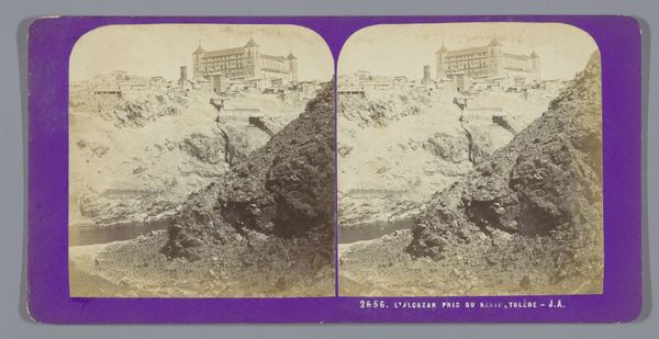 Curator: This is "Gezicht op de zwavelmijnen van Agrigento," a photograph captured between 1862 and 1876 by Jean Andrieu. What is your initial take? Editor: Bleak. There's something about the sepia tones, the washed-out sky... It evokes a sense of desolation. That building atop the hill looms, almost threateningly, over the mine itself. Curator: I agree that the photograph has a bleak mood. The tonality enhances the composition, lending a geometric starkness to the forms. The diagonal of the main hill bisects the composition, focusing our eyes. What do you see here in terms of symbolic content? Editor: Well, sulphur, for starters, has historically strong ties to notions of hell and the underworld. The photograph almost feels like a Dantean vision, doesn't it? This could resonate on a metaphorical level, representing the grim realities of labour and exploitation. The tunnel entrance looks like a maw. Curator: Precisely! The framing of that darkness is vital. As the eye progresses towards the hilltop, a fortress is evident and stands in stark contrast to the cavern below. The overall design creates a compelling visual dialectic of power. Editor: And I cannot ignore the human cost implied here. The sulphur mine and its overseers are juxtaposed in terms of darkness below and an illuminated edifice on the crest, which creates a kind of class-based symbol of dominance. Do you sense the exploitation, here? Curator: The socio-economic symbolism cannot be dismissed, though such an understanding exists almost extrinsically from the aesthetic execution, for it remains in this landscape form. Still, the interplay between the visual elements undeniably lends to a profound commentary on human endeavor. The diagonals created through form, shadow and the angle from which Andrieu composed the piece lead the viewer to assess. Editor: Agreed. It leaves one with a feeling that some essential spirit is being excavated and perhaps squandered... It prompts reflections on societal costs, even if only from our historical vantage point. Curator: Precisely. A strong example, I'd contend, of how formal photographic structure evokes broader social commentaries through elemental design.