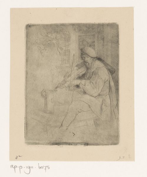 Henri Leys made this etching of a "Minstrel Playing the Violin" sometime in the mid-19th century, using a technique rooted in skilled handcraft. Leys would have started by coating a metal plate with a waxy, acid-resistant ground. He then used a sharp needle to draw his design, exposing the metal underneath. The plate was then immersed in acid, which bit into the exposed lines, creating grooves. These grooves hold the ink, which is then transferred to paper under high pressure. Look closely, and you can see the etched lines, and imagine the labor involved in creating each one. The image itself depicts a musician, a figure who makes his living through skilled performance. It reminds us that all cultural production, whether musical or visual, is rooted in human effort and expertise. By focusing on the material and the making, Leys elevates the status of both the artist and the musician, challenging traditional hierarchies that separate art from craft, and high culture from everyday life.