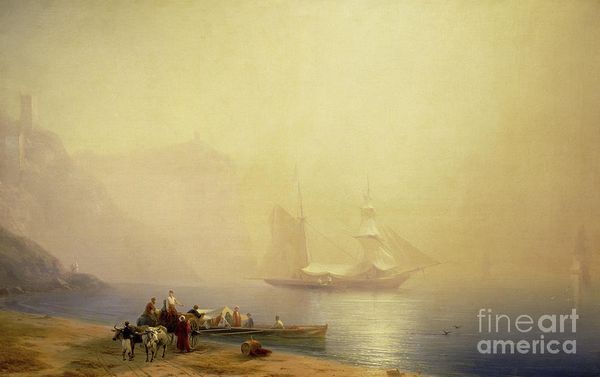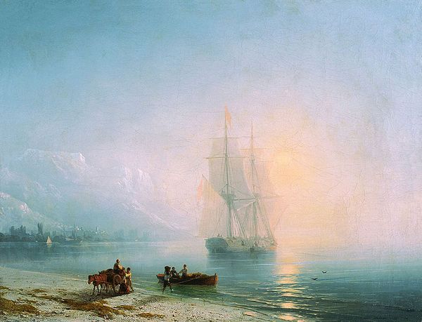 Curator: Immediately, I’m drawn into the gentle haziness of this morning scene – a beach awash in diffused light, barely revealing the ships in the distance. It’s so soft. Editor: We are looking at Ivan Aivazovsky's "Morning in the Bay of Naples", painted in 1873. Aivazovsky, as you know, was a master of marine painting. Curator: "Master" is an understatement! The way he renders the light feels almost…sacred. He truly makes light itself the subject. And, goodness, so romantic, this veil of light and the delicate colours... Editor: Indeed. Aivazovsky operated within the Romantic tradition. His seascapes weren’t merely depictions of the sea, but reflections on man's relationship to it – to the vastness of nature. He worked primarily out of his studio using sketches and memory which gave rise to a prolific career creating sometimes idealized, dramatized, or fantastical images of marine environments. Curator: I see a small grouping of figures on the beach to the left. It lends a sense of scale but, more importantly, introduces an almost genre painting aspect. Are they merely observers or integral to some larger story unfolding? One with a donkey! Editor: Exactly! This juxtaposition of grand nature and human activity was characteristic of Romanticism. Aivazovsky masterfully orchestrates how the atmospheric conditions mute the scene and provide both realistic rendering with dramatic elements of the Sublime. This work reveals also his grasp of art politics—the type of picturesque scene of this location were extremely desirable amongst tourist consumers. Curator: What fascinates me most is the mist...that ethereal quality that transforms the familiar into something magical. Is that odd to say? It's dreamy! Editor: Not at all. His command of oil paint allowed him to depict light in incredibly subtle ways, capturing transient atmospheric effects with astonishing accuracy, also, a real demonstration of technique and knowledge. Curator: Looking at it now, I feel strangely peaceful. I wonder, does that make this a successful painting for our era? Editor: Perhaps. Aivazovsky offers us a reminder of nature's enduring power to inspire awe—a value that feels particularly relevant today. Curator: I find the sea very emotional, here – which isn't to diminish, well, anything else. Just saying I'll carry this feeling through today.