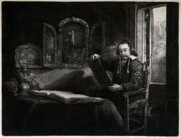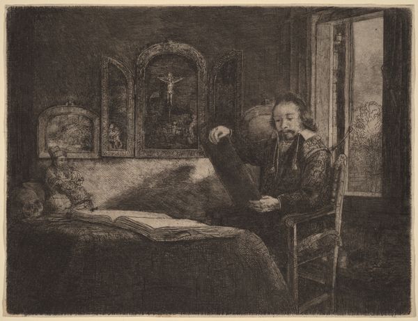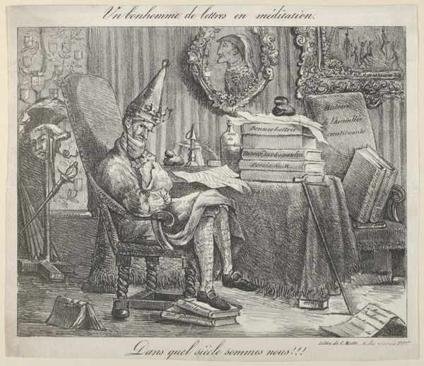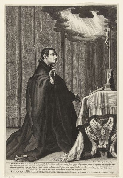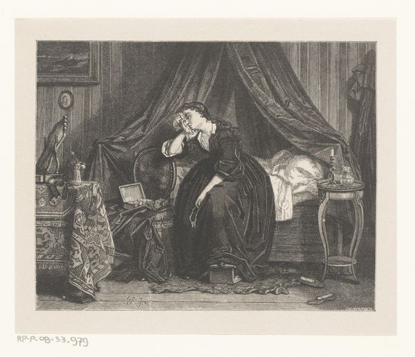 Curator: What a scene! Immediately, I’m struck by the contrast in textures—the rich, almost plush look of the monk's quarters versus the servant’s more rigid posture. Editor: That's an interesting observation. This is "The Canon's Dinner," painted in 1875 by Jehan Georges Vibert. We see a canon enjoying a rather opulent meal while a kneeling figure, perhaps a clergyman or a servant, reads to him. Vibert was known for his genre scenes depicting clerical life, often with a satirical edge. Curator: Satire is right! Look at the lobster on that table! The visual weight of that canopy bed layered with crimson fabric. I am keen on what the underlayers and treatment of this dyed cloth must have looked like during production and laundering processes of the time. The sheen suggests a specific quality of weave… How does this extravagance contrast with the vows we typically associate with religious life? Editor: Precisely! It speaks volumes about the Church’s social standing at the time, its inherent contradictions between vows of poverty and actual material wealth. The figure kneeling underscores that power dynamic through devotional servitude. This work offers, on the surface, a scene, but what kind of patronage was present? Did those of high station admire the power dynamic depicted? What did it say of civic morals if it hung publicly? Curator: And note the setting, the interior space. Not a bare, austere chamber but one filled with objects, presumably acquired, collected, or consumed in some form or fashion to get there, filling his day. How complicit was this figure in upholding this lifestyle? It suggests how profoundly material culture shaped even the most purportedly spiritual existences, reflecting our understanding of labor, resources, and capital during that era. Editor: Absolutely. Vibert used these domestic interiors to comment on society itself. How public-facing was religious imagery meant to be at this time and place in 1870’s Europe? He turns the private life of clergymen into a spectacle of commentary. We gain so much cultural insight into both institutions and consumer life from works such as these. Curator: A potent reflection, then, on the social fabric woven, literally and figuratively, from threads of power, piety, and privilege. The very means of how these oils congealed, the ways their very hues have been struck into the canvas– It becomes a document of production as much as an ideological stance on clerical power. Editor: Indeed. “The Canon's Dinner” reminds us how art serves as a critical lens, reflecting not just aesthetic values, but the broader social and political context in which it was created. It encourages dialogue on a societal institution.