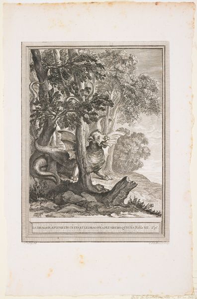 Curator: Ah, "Wapenuitrusting naast een door de bliksem getroffen boom" (Weaponry next to a Lightning-Struck Tree), created in 1798 by Daniel Nikolaus Chodowiecki. This pencil drawing resides here at the Rijksmuseum. The romanticism is apparent here... what's your impression? Editor: Honestly? Melancholy. Profoundly so. The tree reaching towards the sky but so obviously broken. And the armour lying discarded – it’s the quiet aftermath of a battle, a life perhaps irrevocably changed. Or maybe even over. It feels like nature is quietly reclaiming a story of conflict. Curator: I would agree with that first impression of melancholy; certainly, the thematic and compositional elements contribute to such affect. Note the stark contrast between the ravaged tree and the seemingly untouched, even idealized, scene depicted above: the woman in classical robes in pastoral landscape with child. Observe the placement of weaponry in the direct foreground... Chodowiecki clearly delineates binaries here between ideals of love, virtue, life versus brutality, pain, and loss. Semiotics suggests the broken tree represents disruption of natural order. Editor: Precisely! The drawing offers up questions of balance: an uneasy co-existence. The woman might be Hope or Remembrance—who knows?—but the image speaks to me of a civilization confronting the cost of violence. I mean, the discarded helmet specifically really underscores the human toll, doesn't it? Is it a relinquishing of power, a symbolic burial even? Curator: That is a potential, astute reading... certainly. As a formalist, though, I find that line to be, rather... Romantic. Nonetheless, I note your subjective interpretation of “human toll” arises, interestingly enough, because Chodowiecki refuses to anthropomorphize the violence here. Editor: Maybe. Though, doesn't that absence speak volumes, right? Instead, we witness abandoned artefacts set in the wider sphere of an obliterated arboreal wonder... it really drives home the silent, haunting endurance of nature, I feel, bearing witness to humanity's blunders. Curator: Quite. It seems this dialogue has illuminated, for me at least, Chodowiecki’s success: an intersection of art and life. The way such relatively simple composition—the pencil line, in other words—can carry weighty themes in a way which, truthfully, resonates centuries later. Editor: Indeed! This pencil sketch—"Wapenuitrusting naast een door de bliksem getroffen boom"—isn't just some relic of 1798; its emotional and symbolic echo resonates today and still forces us to examine, maybe reassess, who we are.