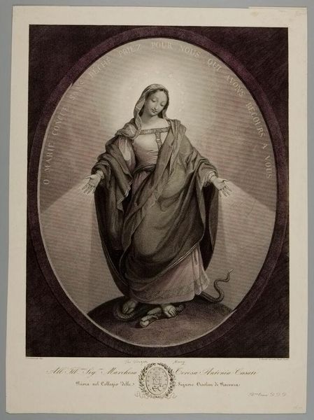 Editor: This is Francesco Bartolozzi's "Madonna," a print from the Harvard Art Museums. It has a very somber tone, and the composition feels very formal. What do you see in this piece? Curator: Consider the delicate hatching and stippling technique. It creates a nuanced tonal range, focusing our attention on the interplay of light and shadow that sculpts the figure’s face and drapery. The oval frame and the brickwork pattern serve to isolate the Madonna, inviting closer scrutiny of her internal state. Editor: So it is about the technique? Curator: Yes, and also, the composition and materiality encourage us to contemplate the abstract qualities of the artwork rather than just its religious subject matter. How does the printmaking medium itself contribute to the work's overall effect? Editor: I see that the print's precise lines add a layer of refinement to the artwork. Thanks for pointing that out!