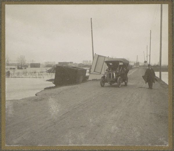 Curator: Well, isn't that just… serene? I'm immediately drawn to the quiet stillness of this gelatin silver print. Editor: Indeed. Here, we have "Twee vrouwen in Volendamse klederdracht op een schuit," which roughly translates to “Two Women in Volendam Costume on a Boat". It’s a work by G. Hidderley, dating roughly between 1900 and 1910. A beautiful example of genre painting that captures a moment of everyday life. Curator: Genre painting is right! Look how carefully the light catches the edges of the boat’s structure and subtly reveals the textures of their traditional clothing. There's something almost painterly about it. You know, when I first glanced at this, I felt an overwhelming sense of calm… like they were waiting for something, or maybe simply enjoying the quiet company. Editor: I appreciate your observation on the materiality of the image; the rough texture around the lower edge, presumably vegetation at the embankment, sharply contrasts the linear structure of the boat and its cabin, all of which seems designed to guide our gaze toward those patiently seated women. The composition is clever in that sense. It prompts a deeper consideration of their space and, by extension, their place in that community and in Dutch society at the time. Curator: Place. That's the perfect word. They're so obviously anchored to this way of life, these traditions… and the photographer, Hidderley, he's capturing not just a picture, but a way of being. There's something enduring about this image, and even a kind of understated reverence. Editor: It is remarkable how this image operates both as a historical document, a cultural artifact if you will, and as a moment frozen in time that allows us a peek at those visual codes. To me, these codes seem to signal how identity and cultural practices get embedded in material objects. I leave contemplating what they might say about that transition. Curator: Yeah, the symbolism of their clothes...It makes you wonder about their personal stories. Like, who are they outside of the Volendam costume? That part’s kind of dreamy. Anyway, this old silver print seems so alive, don’t you think? Editor: Certainly, one comes away appreciating how G. Hidderley, working with limited palette and materials, managed to craft such a powerful snapshot of Dutch life.