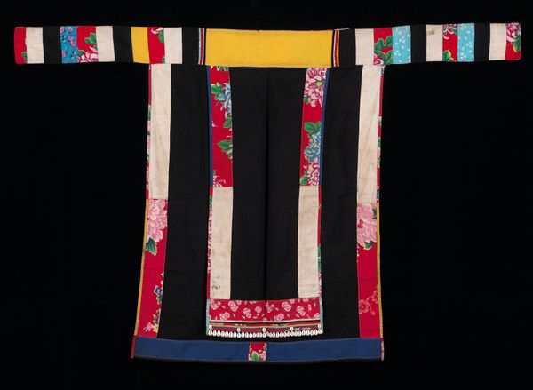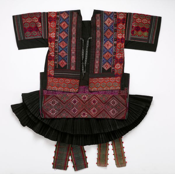 Editor: This striking piece, titled "Blouse with Attached Skirt," is of unknown date and origin. We know it's made with cotton and weaving techniques, placing it in fibre art. I'm immediately drawn to the stark contrast between the black top and the intricately patterned skirt. What cultural narratives do you think this piece whispers? Curator: That’s a wonderful starting point. This object, while aesthetically pleasing, operates within a complex system of cultural and political forces. Consider how textiles, particularly those with intricate designs in cultures like China, aren't simply clothing, but signifiers of status, identity, and even resistance. The contrast you mentioned may also reflect a separation or tension within these categories. Editor: So, is it meant to convey something about social standing? Curator: Quite possibly. The level of detail and craftsmanship certainly speaks to a specific kind of labor and resource allocation. Also, it could challenge the traditionally separate realms of "art" and "craft", where functional objects like clothing are often excluded from fine art discourse. Think about who gets to decide what is art and what isn’t, and how power dynamics play into these definitions. Does this perspective change how you view the piece? Editor: Absolutely. Seeing it as a statement, or even a subtle form of cultural commentary through craftsmanship, gives it a whole new dimension. I was initially just focusing on the design itself. Curator: It is a good start, because art, even in the everyday, has a public role. Considering these objects within their social, cultural and political frameworks is vital. Editor: I’ll remember that! It's really interesting how even a garment can tell us a story about more than just aesthetics. Curator: Indeed. Now we can continue to reflect and analyze many others similarly!
