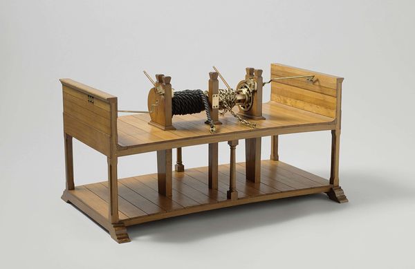 This is a Model of a Chain Stopper, created by an anonymous artist, using wood and metal. At first glance, the model evokes a sense of mechanical precision with the dark metal components contrasting sharply against the lighter wooden structure. The arrangement of geometric forms—cubes, cylinders, and planar surfaces—creates a structured and visually intriguing object. The Chain Stopper presents an intersection of form and function. Its visual impact is a direct result of its structural integrity and material honesty, reflecting a modernist sensibility where the essence of an object is revealed through its construction. The composition invites us to consider how each element plays a crucial role in the object's overall purpose and aesthetic. Ultimately, this model transcends its utilitarian origins. By carefully examining how it integrates both form and function, we appreciate not only its mechanical ingenuity but also its capacity to embody deeper structural and semiotic meanings.