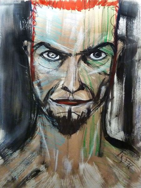 Editor: Here we have Dave Macdowell’s mixed-media painting, "Wendy My Darling." It gives me a dark, surreal feeling. What stands out to you, in your reading of the piece? Curator: What grips me first is the dance between clarity and obfuscation. Macdowell layers recognizable imagery – is that Jack Nicholson’s haunted visage from "The Shining?" - to evoke not just a portrait, but a psychological state. See how Wendy is almost spectral within his face? It is like he’s devouring her. Or is he protecting her? Is this perhaps less of a portrait, and more of a visual power dynamic? What do you feel? Editor: I think she seems terrified, a trapped-in-amber quality, especially with his intense gaze bearing down. Curator: Exactly! It’s the kind of gaze that freezes you. He imprisons with those baby blues. It’s as if the famous zigzag carpet pattern from the Overlook Hotel has infiltrated their very beings, trapping them both. You know what occurs to me? That maybe domestic horror is scarier than supernatural spooks! Editor: I didn't initially make that connection, but seeing the carpet design overlaying everything is unnerving. It suggests nowhere is safe, which, yes, can be terrifying. Curator: Macdowell offers such an intriguing invitation to see familiar horror in a fresh, immediate way. Like peering through a peephole into someone’s nightmare! Editor: Thanks, that's given me a completely different perspective on it. Curator: Absolutely, art should challenge, invite speculation and give chills too, eh?