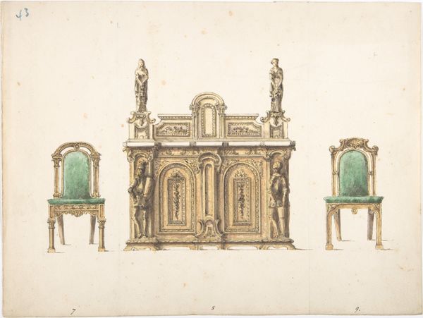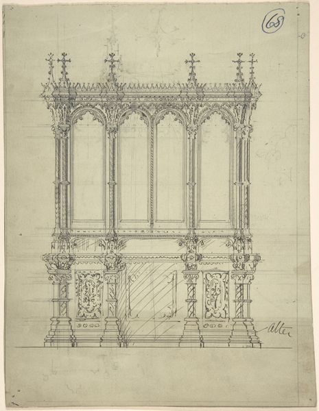 This graphite drawing depicts a design for a Gothic Sideboard by Charles Hindley and Sons. Its pointed arches and quatrefoil motifs are visual echoes of medieval cathedrals, invoking a sense of historical grandeur. Consider the shield emblems adorning the structure. Shields, throughout history, have symbolized protection, valor, and lineage. They appear not only in heraldry but also in ancient mythologies, where gods are often depicted bearing shields. This motif has undergone transformations, from functional battle gear to purely decorative elements, yet its core association with identity and security remains. Subconsciously, the recurrence of such symbols taps into a collective memory, engaging viewers with a sense of continuity and heritage. Thus, this sideboard is more than mere furniture; it is a vessel carrying cultural memory, its symbols resonating with layers of meaning that time cannot erase.