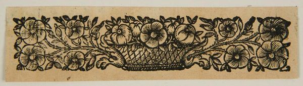 Editor: This small, anonymous print, "Head- or Tail-piece," shows a basket overflowing with flowers. It feels like a celebration of abundance. What stories do you think this image might tell? Curator: Well, prints like these were often used to mark beginnings or endings of texts. Considering its potential placement, how might this image serve as a commentary on the stories it frames? Think about who had access to literacy and leisure in the period this was likely created, and what messages a floral arrangement might convey about class or gender. Editor: So, it's not just about the flowers themselves but about who gets to enjoy them, and what stories are considered worth telling? Curator: Precisely. It encourages us to question whose voices and perspectives are centered within the narratives. Editor: That's a perspective I hadn't considered. Curator: Art can do that, it challenges us.