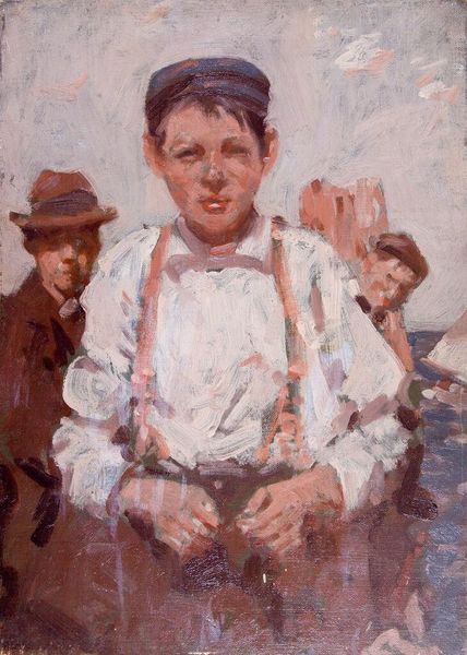 Curator: Oh, this piece just exudes a certain kind of knowing melancholy, doesn't it? A feeling of long days and hard work. Editor: Yes, this is Leon Wyczółkowski's "Fisherman with a Net," created in 1891. It offers an intimate glimpse into the life of a worker during that time, rendered with a touch of impressionistic flair. There’s a subtle but palpable tension there. Curator: Definitely. The netting itself—it feels almost like a screen, separating us from him. Trapping him, maybe? The colors are lovely, but there's also a feeling of being… heavy. Editor: It’s interesting that you pick up on the theme of confinement. Throughout the late 19th and early 20th centuries, depictions of labor often carried a loaded social commentary. I think Wyczółkowski is not simply painting a portrait here; he's exploring the very concept of labor and its impact on identity. Look at the way he obscures the fisherman’s eyes beneath the brim of the hat—as if trying to erase this individual’s face. Curator: Right. You almost don’t see him, at first. Then the weariness of it all just hits you. I also feel that Wyczółkowski captures the quiet dignity of the man, the unspoken wisdom etched into his face. It feels respectful, almost reverential. Editor: Absolutely. Wyczółkowski avoids idealizing the subject; instead, we're presented with a raw, unfiltered portrait of a man whose existence is deeply intertwined with his labor. It's a very humanizing approach, resisting the impulse to either romanticize or demonize the working class, so prominent at the time, especially with industrialization changing the way people worked. Curator: It really does make you wonder about his story, doesn’t it? What was his life like beyond the net and the catch? The painting feels like a portal, opening a doorway to a forgotten time and a different way of life. It whispers stories of hardship, perseverance, and resilience. Editor: Exactly. And that quiet dignity, I think it serves as a testament to the working class, not only then but today, still working under difficult conditions all over the globe. It compels us to engage in conversations about inequality and representation in art history and beyond. Curator: I love the little moments like that, when a work of art keeps spiraling out—when it opens us up and keeps asking questions long after you've turned away from the frame. Editor: Precisely. Hopefully this prompts a moment of introspection and perhaps a renewed appreciation for the figures who are often overlooked in the grand narratives we are accustomed to.