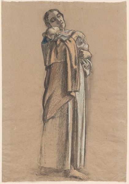 This is Edwin Austin Abbey’s study for Louis Comfort Tiffany’s center window for ‘Children’s Window’, a preparatory work of uncertain date. We see a figure in a light yellow robe and a blue undergarment, drawn with delicate, precise lines against the grid. The figure looks up to the left, hands clasped at chest level with an ethereal quality. Abbey's use of the grid as a compositional device to achieve correct scale is reminiscent of Durer's use of similar geometric systems. The linear structure contrasts with the naturalism of the robe's folds. This tension makes us question fixed perceptions of space and form. The halo, rendered as a bright yellow circle, contrasts with the softness of the rest of the image. The halo's simplicity juxtaposes against the robe's complexity, emphasizing the conceptual and the concrete. The geometric regularity is a subtle reminder of the artist's hand and the artificiality of representation.