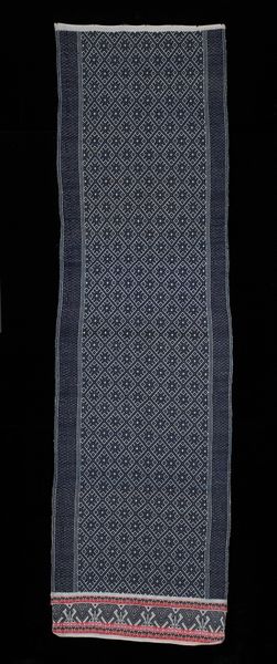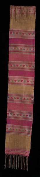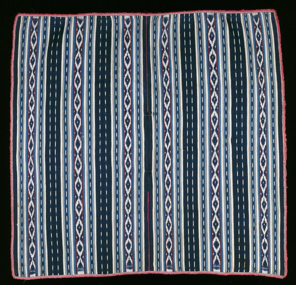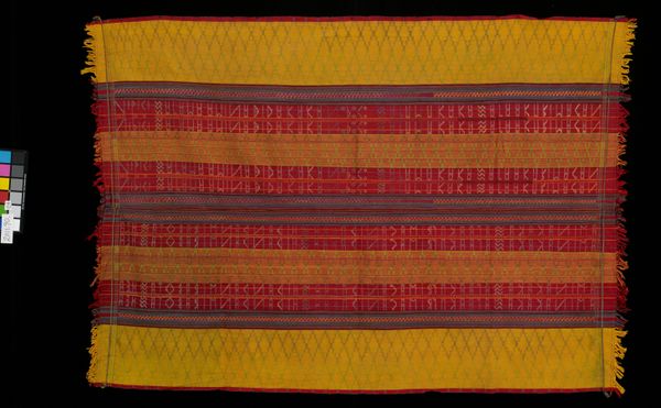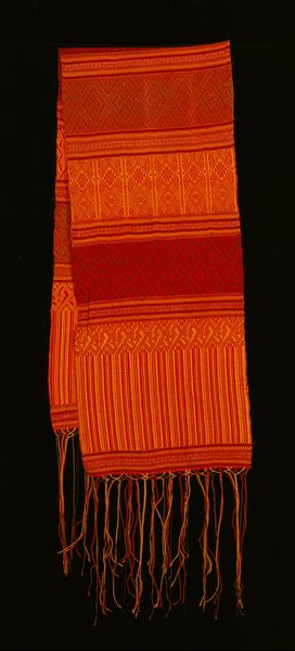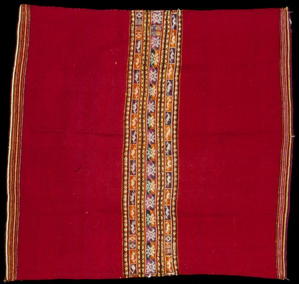 Curator: Today we’re looking at "Half Aksu (skirt)," a textile piece made sometime between 1965 and 1975. You can find it here at the Minneapolis Institute of Art. Editor: Immediately I see something almost elemental here, earth and fire. The dark, possibly woolen, expanse gives way to these brilliant bands of woven color... it breathes life! Curator: Absolutely, and thinking about the hands that created this, it is really something. The piece combines weaving and possibly some hand-embroidered details. The base seems to be a sturdy, plain woven wool, contrasted against these elaborate supplementary weft patterns. It prompts questions about skill, labor, and the cultural context of textile production at that time. Editor: I'm particularly drawn to how the geometrical repetition softens; it’s strict but somehow gives me the sensation of almost gazing into infinity. Considering its creation date, one has to wonder about its significance – could this be viewed through the lens of Pattern and Decoration, challenging high art hierarchies? I almost see in my mind's eye that the garment itself in motion would shimmer almost like running water. Curator: Well, certainly, it pushes against any clear separation between ‘art’ and ‘craft,’ right? Someone carefully chose each thread, dictated not just by visual design but functional, durable consideration. I wonder if the piece served both everyday and ceremonial purposes? The dark ground color does certainly feel grounded... literally, down to earth. Editor: Agreed! It certainly hints at the weight of tradition but without stifling personal or cultural expression. So it manages to hold onto that sensation, in a certain point of time or maybe within a community. This textile goes beyond just utility; it tells a complex narrative. I think about the person that may have donned it. It does become a question... who might they have been? Curator: It all leaves one with this sense of untold stories—fabric imbued not just with skill, but also with silent memories. Thanks for the chat! Editor: Thanks. An invitation to reflect not only on what is seen, but what’s deeply felt... lovely!