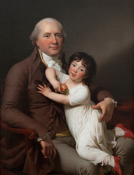 Editor: We're looking at Charles Willson Peale's "John Cadwalader Family," created around 1772 using oil paint. It's striking how the artist captures such a feeling of formal domesticity. What do you see in this piece? Curator: From a formalist perspective, the composition reveals a calculated arrangement, carefully constructed. The pyramidal structure, anchored by the figures, leads the eye through a hierarchy of gazes. Notice how the restrained palette – muted browns and creams – contributes to the sense of decorum. Editor: Decorum, definitely. I hadn't considered the importance of the colors, but the subdued palette creates a very serious mood. Is that peach significant in any way, with its contrast? Curator: Its function within the formal arrangement warrants consideration. The sphere of the peach echoes the curve of the mother's arm, creating a visual link and adding to the overall harmony. One must also examine its texture; does the sheen of the fruit compete with the luxuriousness of her dress? Does it function to direct the viewers gaze from foreground to background? Editor: That's interesting, this harmony between figures by the shapes and colors... But in that era, wasn’t there some expectation for art to communicate things beyond its shapes and lines? Curator: While broader societal narratives certainly exist, and cannot be ignored, I posit that an object's inherent qualities merit interrogation above all else. After analyzing it's materiality, one must appreciate the sheer meticulous detail. It becomes its own story, divorced from direct contextual moorings. Editor: I see what you mean. Focusing on the elements within the frame gives it a whole new kind of voice. Curator: Indeed. The painting’s semiotic potential is heightened when one considers the artist's decisions as material fact, allowing the intrinsic qualities of a picture to manifest new potential with the absence of outside factors. Editor: This has really opened my eyes to looking at art in a new way; by examining visual components over content. Curator: And by extension understanding the choices within it, absent all preconceived notions, one can access the real story being told within.