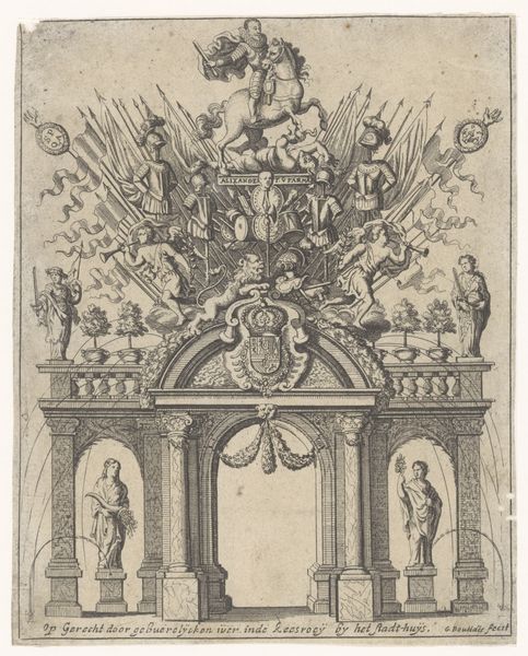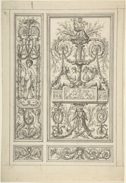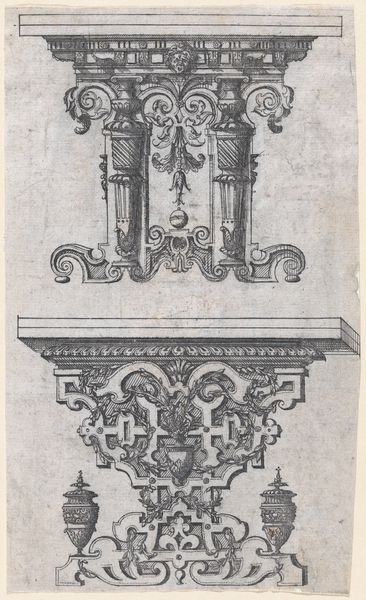 Editor: So, this is Giovanni Battista Piranesi's "Fantasy of a Façade with Bizarre Ornaments," created between 1764 and 1766, using ink and etching on paper. I’m struck by how theatrical it feels, like a stage set. The level of detail is astounding. What's your interpretation of this drawing? Curator: The architectural structure commands immediate attention, specifically, the deliberate layering of disparate architectural elements. The formal arrangement demonstrates a conscious manipulation of depth and perspective. How do the bizarre ornaments and seemingly incongruous representational zones speak to you? Editor: They feel like fragments of a dream or a collection of random artifacts. The whole facade seems unstable and unsettling, although, the detail is amazing and pulls me into the drawing. What effect do you think Piranesi was trying to achieve? Curator: Consider the power of line in creating both the structural integrity and the destabilizing ornamental features of the work. Each etched line contributes to the overall impact. I’m interested in how this intricate linear design both builds and questions the formal constructs of the image. Do you perceive a balance or tension between these two functions? Editor: Definitely tension, a visual push-and-pull. There's a strange beauty in the unsettling feeling it creates. The stark medium only adds to that feeling of intense yet unreal structure. I hadn't considered that until now. Curator: Precisely. Piranesi exploits the visual vocabulary to orchestrate a play of balance and tension. Thank you for observing that. Editor: I’ll certainly remember this piece. It’s helped me appreciate the relationship between the unsettling subject matter and the detailed construction.