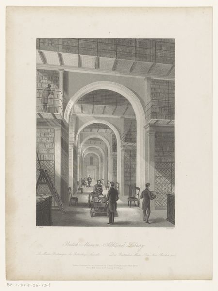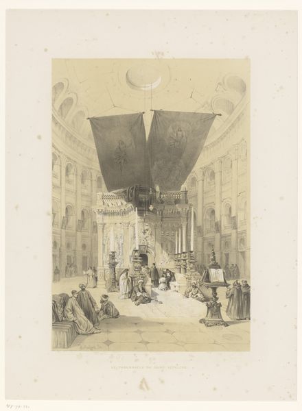 Curator: Let's discuss Joseph-Philibert Girault de Prangey's 1843 engraving, "Interior, Mosque of Ibn Tulun", currently residing at the Metropolitan Museum of Art. Editor: My goodness, what an echo chamber of solemnity and grandeur. It whispers of age and quiet contemplation, a sense of people finding peace within ancient stones. It feels... reverent. Curator: Indeed. Girault de Prangey was quite interested in documenting the architectural and cultural landscape of the Middle East in the 19th century. This engraving provides a vital visual record, highlighting not only the Mosque’s structural majesty, but also daily life within its walls. We see people engaged in prayer and study. Editor: I am so curious about the men clustered on the left! Is that a teacher among them? You can feel a very tangible exchange of ideas, it feels like you can overhear their discussions about theology, or architecture. They're at a real nexus point within the Mosque! Curator: Precisely, those kinds of casual arrangements speak to the building’s everyday functions. This piece, being an engraving, allowed for a level of detailed replication, enabling its circulation to a wider European audience who may have had no other exposure to such sites. Consider its role in shaping European perceptions of Islamic architecture. Editor: It’s strange, because although it’s monochromatic, the patterns and the shadows give the architecture depth, an almost palpable sense of heat. Curator: Absolutely, note how Girault de Prangey used light and shadow to emphasize the scale and repetition of architectural features like arches and columns. It draws your eye down the length of the prayer hall. Editor: So, in essence, we're not just admiring pretty arches; we're confronting a constructed narrative, an exchange of visual information regarding architectural wonders of other regions of the globe! Curator: An insightful remark about the piece and its broader role as a transmitter of cultural information in the 19th century, yes!