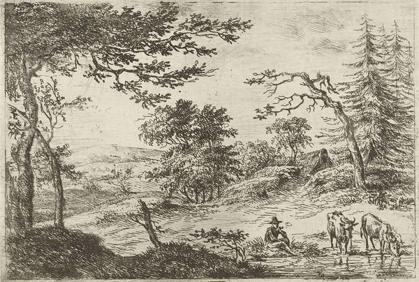 Editor: Here we have David van der Kellen's "Landschap met familie," a print created sometime between 1814 and 1879. I'm really drawn to its intimate portrayal of everyday life. How do you read this piece? Curator: It's a classic example of 19th-century Romanticism, deeply rooted in its socio-political context. Notice how the family is situated within an idealized, harmonious landscape. These images became increasingly popular with the growing middle class, reflecting their desire for stability and a connection to nature during a period of rapid industrialization. It presents a romanticized vision of rural life, almost as a form of escapism. Editor: That makes a lot of sense. I was thinking of it just as a quaint snapshot, but now I see it also serves as a counterpoint to urban life at the time. Is the prominence of the landscape also part of that escapism? Curator: Absolutely. The landscape isn't just a backdrop; it's actively shaping the narrative. Consider the composition – the family is dwarfed by the natural world, yet they exist harmoniously within it. It suggests a natural order, one untouched by the upheavals of industrial society. Van der Kellen strategically uses etching techniques to create an immersive and peaceful environment for the viewer. Editor: That’s fascinating! So, it's less about a specific family and more about representing a widespread yearning for a simpler, more 'authentic' life, as industrial society progressed. Curator: Precisely! It uses idealized imagery of nature to make a powerful statement on cultural values. Seeing it like this makes one think differently about art's societal role. Editor: I never would have thought about it that way. Thank you.