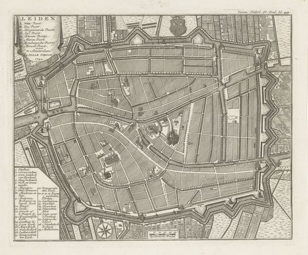 Curator: Here, we have "Plattegrond van burgerwijk nummer 7 te Amsterdam, onder leiding van kapitein Jan de Lange," an etching, most likely a print, dating from after 1734. Editor: Whoa, I immediately get a kind of stoic, old-world feeling from this. Like a meticulously planned chessboard frozen in time. It's intense, formal, but also kind of cool. Curator: It presents a formal, structured depiction of Amsterdam’s burgerwijk number 7, district number seven, under the direction of Captain Jan de Lange. The meticulous detail is very much aligned with Baroque conventions, embracing precision and complexity in its rendering of the urban space. Editor: It's not just precise, it's ornate! The coats of arms, those little cherubs. But the severity of the street layout and building masses bring me back to earth. Curator: The composition employs a hierarchical layout; cartographic symbols provide structure and legibility, while decorative heraldry enriches its visual complexity, fulfilling functional and aesthetic purposes simultaneously. Editor: But it’s so rigid! I imagine this district being extremely organized and strict—I mean, the thing is nearly symmetrical. Does the regularity offer a symbolic element? I almost sense some political message woven in there? Curator: Yes. These maps functioned as more than geographic representations. They imposed order, clarified property boundaries, and reinforced the existing socio-political power structure of the era. The order that you notice underscores and reaffirms stability. Editor: So it is propaganda, but beautiful propaganda. To me, it's strangely calming despite the rigidity and the serious aura of "planning." There's something oddly poetic about that control— the attempt to tame life into a perfect design. Curator: Agreed, this baroque map encapsulates the ambitions and aesthetics of its time, masterfully articulating authority through cartography and civic pride with fine, calculated line work and symbolism. Editor: Seeing the etching in this manner allows me to appreciate not only its practical applications, but also its power as an artifact, as an expression of ideals. This map reveals something timeless.