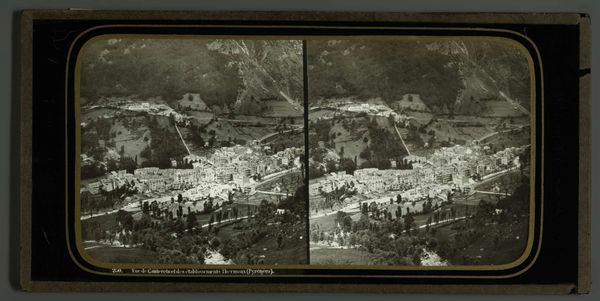 Curator: Before us we have "Gezicht op Villefrance-sur-Mer, Frankrijk", a stereoscopic photograph created sometime between 1860 and 1870 by Ferrier Pére-Fils et Soulier. What strikes you first about this particular cityscape? Editor: The layering, definitely. The composition creates a strong sense of depth with that hillside looming over the buildings. I find the monochromatic palette almost… melancholic. Curator: It’s interesting you mention melancholy. Stereoscopic images, while intended to simulate depth and offer a more "realistic" view, also served to propagate certain romanticized visions of Europe. Villefranche, with its strategic port, would have been of particular interest to French colonial ambitions at the time. Editor: Absolutely. And photography, being relatively new, carried immense power in shaping perceptions of places and people. How were these images distributed? Who were the intended consumers? It certainly was not the working class that might have lived here. Curator: These images would have been circulated widely among the upper and middle classes. They became essential souvenirs of leisure travel. Think about it – this allowed consumers to experience distant places from the comfort of their homes, bolstering a sense of national pride and reinforcing colonial power structures. Editor: It feels vital to address the labor that made that leisure possible, too. Where does the toil of the residents of Villefranche factor into this seemingly placid scene? Did people who looked like me have access to this imagery or this leisurely vacation? Curator: That tension is what makes this piece so interesting. The very act of taking this photograph implicates it in a complex web of social, political, and economic realities. It wasn't merely capturing reality; it was curating a specific version of it. Editor: I see what you mean. So what we view here isn’t simply an idyllic seaside village. The artwork embodies and propagates a vision embedded within structures of power. Thanks for illuminating its depth, Curator. Curator: Indeed. Thank you for contributing your own very insightful lens, Editor.