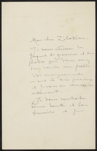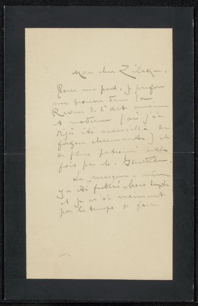 Curator: What a find! We're looking at a letter from Fernand Khnopff, a luminary of Belgian Symbolism, penned sometime before 1894. It’s titled "Brief aan Philip Zilcken," crafted with ink on paper. It gives one pause to reflect on the relationship between the artist, the medium, and the content itself. Editor: My initial impression is… tactile. The rough edges of the paper, the density of the ink—it screams materiality. It invites the viewer to imagine the very hand of the artist. There’s something so intimate about seeing the direct transfer of thought to paper. Curator: Indeed. Khnopff's elegant script exhibits an undeniable flow, a controlled freedom that mirrors his refined artistic sensibility. This particular shade of sepia, the layout of the handwriting on the sheet, creates a sophisticated rhythm, almost a silent choreography. Editor: And consider the labor invested. Ink wasn't just something you grabbed off the shelf—it was mixed, prepared, a craft in itself. Paper, too, would have been handmade, possessing inherent qualities influencing the writing experience. What do we even know about the mill it came from? The socio-economic systems involved in its production? Curator: While context is important, let us consider its inherent structural beauty, as form and expression cohere as one. Notice how each loop and line constructs distinct fields of shapes upon the paper plane. Observe the letterforms' subtle echoes from a bygone age, imbued by a symbolic visual language that carries more weight than the semantic content. Editor: Absolutely, the structure gives form to the message. But beyond pure aesthetics, its medium makes it. We often consider "high" art separate from everyday items such as this. However, there is craft, there is material, there is process. A symbolic expression may well come at the very origin of ink, pulp, and hand. It is not just content. Curator: I agree there's something beautiful to seeing such utility so skillfully combined with visual artifice. Editor: Ultimately, an encounter with pieces like these reminds us that art is fundamentally a social process, a record of human activity. Curator: Well, on the structural front, it has prompted my thoughts towards symbolism and a renewed appreciation for Khnopff's deft composition. Editor: For me, seeing Khnopff's hand so intimately connected with everyday production encourages thought toward the social context in his time.