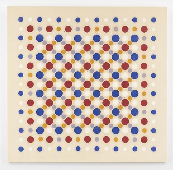 Curator: This intriguing mixed-media artwork, "Yvon Lambert," by Louise Bourgeois, presents a compelling study in pattern and repetition. Editor: Wow, it's hypnotic! It looks like a portal or two…a bit unsettling, yet somehow calming. Is that fabric? Curator: Yes, the piece incorporates textile elements to create these repeating geometric patterns, specifically these eye-like compositions, which contribute significantly to its overall visual texture. Editor: There's a definite feeling of obsessive crafting, the kind where the making *is* the meaning, you know? I can almost feel the artist's hands meticulously working on this. It reminds me of quilt making, maybe related to themes of domestic labor and obsessive-compulsive behaviour. Curator: Precisely. Bourgeois's choice of geometric forms, in particular, resonates with broader modernist concerns with order and structure but her focus on repetition evokes a sense of ritualistic labor that challenges the strict rationalism sometimes associated with that movement. Thinking of modernism as an ideology, her deconstruction allows room to elevate marginalized experiences through these patterns. Editor: I'm thinking about the indigo color scheme... and something almost nautical... Are those whirlpools or gateways on two parallel oceans? Or more grounded, those round table cloths under repair… The choice of simple elements also brings a stark contrast within. It is simple yet captivating. Curator: Exactly! It prompts inquiries into its simplicity in conjunction with these intense geometries. It evokes ideas about the interplay between domesticity and intellectual exploration as intertwined, a key area of understanding Bourgeois' work in dialogue with broader social themes about womanhood. Editor: There’s a raw, almost vulnerable quality too. It's not overtly polished; there’s a sense of honesty that makes it incredibly impactful, right? Curator: Indeed. These are powerful examples of how seemingly simple aesthetic strategies like patterned and repetitive actions can allow Bourgeois to critically interrogate ideas of modernism and identity, whilst simultaneously creating beautiful abstract meditations. Editor: Yeah, there's something profoundly human, maybe therapeutic, in creating these repeating patterns. Almost an invitation to fall into the art. I feel somehow centered having observed it carefully, now... Curator: I am glad you feel like that. Her intersectional approach using basic aesthetic values allowed me to think more openly today.