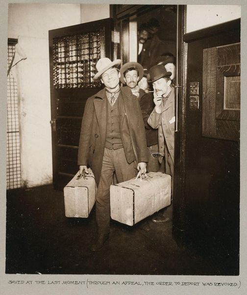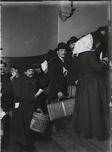 Editor: This photograph, titled "Races, Immigration: United States. New York. New York City. Immigrant Station," captures a group of men with their belongings. They appear tired, anxious. What symbols do you notice in this scene? Curator: The bundles and bags signify disrupted lives and journeys undertaken. Notice how each man carries his burden differently, a visual echo of diverse backgrounds and experiences converging at this port of entry. It speaks to collective displacement. Editor: Collective displacement? Can you expand on that? Curator: Yes, the hats, the worn clothing... these are not merely details, but indices of identity, aspiration, and resilience in the face of systemic challenges. It hints at the psychological weight carried. What is remembered, what is lost. Editor: That's a powerful way to look at it. I'll remember to consider the symbols within the image as representative of wider stories.