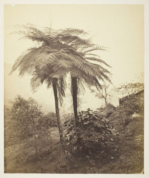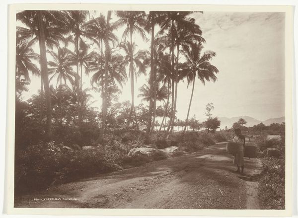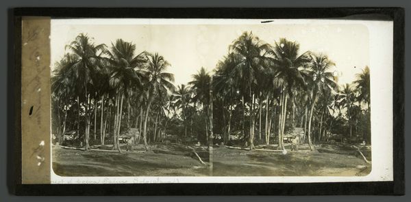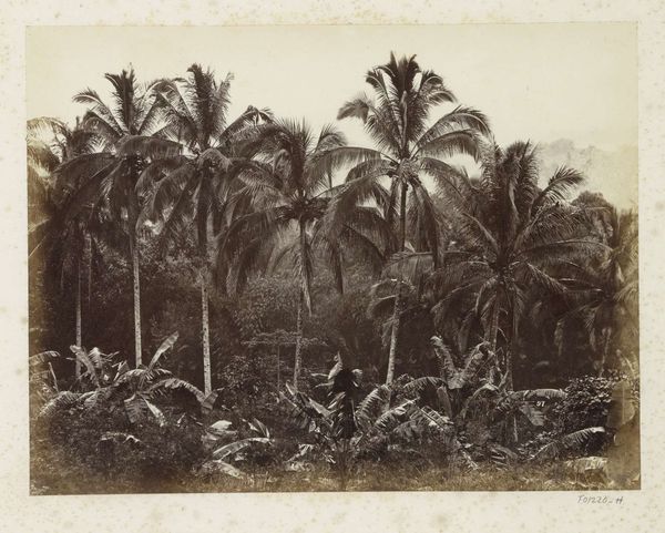 Curator: Let’s take a look at “Coronie,” a photograph by Hendrik Doijer, likely taken between 1903 and 1910. Editor: Well, right away, I get this sense of...humidity, you know? The heavy air just hangs there, doesn't it? All those drooping palm fronds. Curator: Exactly! Doijer captured a very particular environment, paying close attention to the indigenous materials in the setting. He was really focusing on this intersection of landscape and the people who lived and worked there. It depicts the specific environment, but also likely some sense of life and labor linked to coconut production in that specific place. Editor: There's something about the stark black and white too... it kind of romanticizes the hard labor that must've been involved. I'm imagining workers toiling under that sun, and then this photo almost turns it into a postcard. A rather eerie postcard, admittedly. Curator: That tension is central. We see the photographic techniques employed, such as realism to depict an objective scene of the landscape, and the composition highlights how these photographic methods interact with complex ideas of colonialism. Who is framing the scene? And how does that framing dictate the narrative of a faraway colony for European consumption? Editor: Oof, heavy stuff. And it all stems from these seemingly simple palms, rendered in monochrome. They’re both beautiful and haunting, knowing the context you give. I feel a responsibility in appreciating something beautiful, while at the same time appreciating the labor involved, and the artist's purpose. Curator: It speaks to the power of photography, right? How a single image can condense such complex realities, while simultaneously obscuring aspects through selection and technique. The choice of focusing on trees abstracts all other aspects and perspectives, creating, essentially, tropical orientalism. Editor: A reminder that even the most serene image carries a weight. I leave contemplating our place, our perspective, when it comes to capturing "paradise."