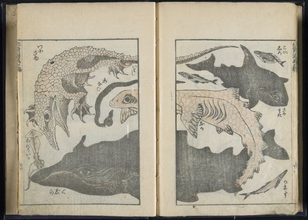 Curator: Here we have a look into the artistic process, through a page from “Transmitting the Spirit and Revealing the Form of Things—Hokusai’s Sketchbooks.” Produced around 1849 by Katsushika Hokusai, it presents ink drawings transformed into a printed form. Editor: There’s a haunting, theatrical quality. The figures emerge from deep, inky blackness, heightened by the crisp lines defining form against the abyss. Curator: Hokusai's sketchbooks offer a glimpse into his mind, bridging observation and imagination. The dragon, in particular, stands as a powerful symbol, seen alongside a human figure who seems caught in the midst of performing in a stylized manner. Editor: It evokes classical theater, maybe even a Kabuki performance. I wonder about the dragon's context. It's not just decorative; it feels symbolic of untamed nature or chaotic energies. It's forcing me to wonder about the nature of power within this image, and if that performative figure on the right could have any? Curator: Dragons, and figures with stylized movements, permeate much of Edo period art, including Hokusai's works. One interpretation might be as representations of the formidable forces, whether spiritual or political, that governed society at the time. Think about how these images served not only artistic pursuits but also broader cultural purposes. Editor: This makes me question the access and intended audiences for the sketchbook, if it would have served a purpose for the broader public, given its status as a "personal sketchbook". Was this artist wrestling with ideas of cultural strength and governance privately, for later public distribution, or neither? Curator: Well, Hokusai's "sketchbooks" as we see them now may not fully reflect their original, intended format. These are later collections that serve to provide the public a look into the world of an artist of this time. And how wonderful that museums allow for such dialogues centuries later. Editor: Absolutely, it’s these fragments of the past that remind us of the complex interplay between the personal and the political, offering new views of our own current landscape.