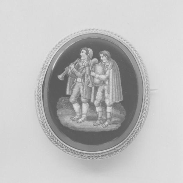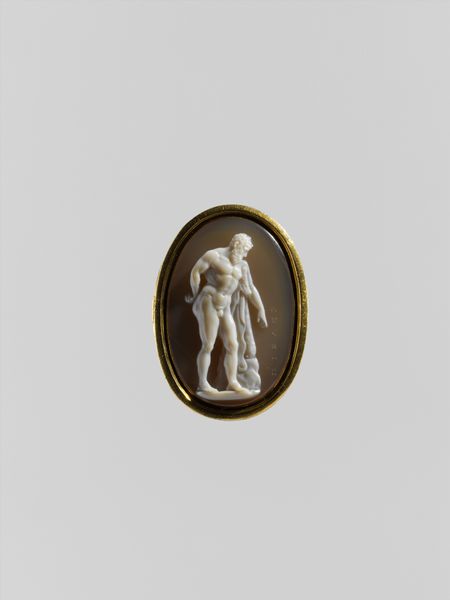 Editor: Here we have "Cupid with a Dog" created sometime between 1860 and 1870 by Luigi Saulini. It’s a gold and metal relief sculpture, currently residing at the Metropolitan Museum of Art. The workmanship looks delicate, the smooth white relief contrasting with the peach background. What is your impression of this piece? Curator: The work exemplifies a mastery of line and form. Consider the elegant curve of Cupid’s body echoed in the dog’s pose, creating a visual harmony. The gold setting enhances this symmetry and balance, with careful arrangement in relation to the relief sculpture. Do you notice the implied diagonal created by the placement of the figures, counteracted by the solid horizontal base? Editor: I see what you mean, now that you mention it. It almost looks like the figures are about to topple without that solid base and contrasting lines! It’s very subtle. Is this sort of compositional awareness typical of academic art of this time? Curator: It’s not only typical, but in a way definitional. Academic art relies heavily on balance and symmetry to convey underlying symbolic significance. Here, the opposition of vertical and horizontal axes is fundamental to establishing visual equilibrium. Consider also the color; the subdued tones serve not to distract but to focus our attention on shape and line. The intrinsic visual language provides the substance. Editor: I never thought about art like that, I’m used to seeing messages or symbols. Focusing solely on form makes me see it differently! Curator: Precisely, the essence lies not necessarily in symbolic interpretation, but in its fundamental artistic components. A painting is, ultimately, line, shape, and colour; consider this work as the nexus of this combination. Editor: That’s a wonderful insight. I’ll definitely view artwork with an eye towards those basics from now on!