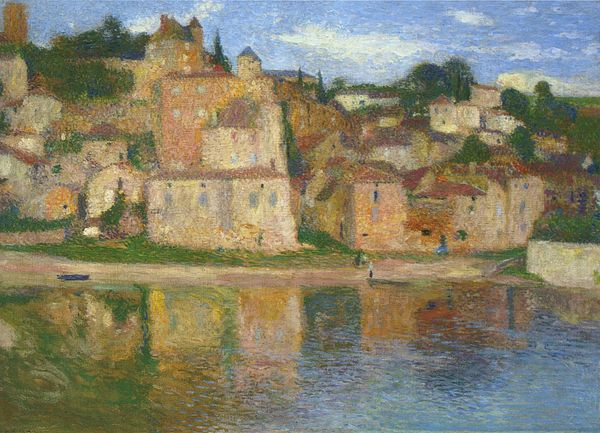 Henri Martin captured "The Village in Port of Collioure" with paint, creating a landscape where the material handling of color dominates our visual experience. The painting is constructed through countless small strokes, each a deliberate mark that contributes to the overall tapestry of the scene. The composition invites a reading of contrasts: the static mass of the village against the fluid expanse of water, the earthy pigments of the landscape offset by the luminous blues of the sea. This juxtaposition isn’t merely descriptive but acts as a structural device, creating a dynamic tension that holds the viewer's gaze. The materiality of the paint, applied in such a textured manner, calls attention to its own presence, disrupting any illusion of a seamless representation. The scene is divided by a horizon line into earth and water, challenging a fixed meaning. This division reflects the semiotic breakdown of boundaries and emphasizes the artwork as a site for ongoing interpretation.
