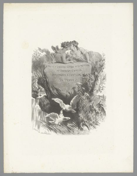 Editor: Here we have "Tekstblad met een koekoek op een tak" from 1892 by Theo van Hoytema. It looks like an engraving or print on paper with a bird perched on a branch, surrounded by text. There’s a quiet, almost melancholic feel to it. What strikes you about this piece? Curator: The cuckoo itself, a creature often linked to cycles, announcements, even infidelity, sits rather passively on that branch, doesn’t it? And consider the text intertwining with the natural forms, it merges visual and linguistic communication. It creates a cultural memory, reflecting back the stories we project onto this little bird. How does the text relate, in your mind, to the imagery surrounding it? Editor: The text seems to suggest the cuckoo is sharing a thought - that humans should have a king. The visual weight feels imbalanced, with text and image vying for attention. Does that tension serve a symbolic purpose? Curator: Absolutely. Hoytema uses that very tension. He draws upon the history of visual storytelling itself! A seemingly simple illustration becomes a loaded symbolic representation. Do you think he chose the cuckoo at random? What associations did the bird have for people then? Editor: Probably not random. Cuckoos are linked with springtime but also with cuckoldry. Perhaps he is making a comment about the potential deception in the idea of monarchy. Curator: Precisely! Hoytema exploits that ambiguity. The image acts as a cultural flashbulb, revealing hidden assumptions about leadership and the natural world. And do you think the print medium itself changes our understanding? Editor: Definitely. Prints make ideas more accessible, widening their influence. It feels almost like a political cartoon, wrapped in art nouveau elegance. I hadn’t considered the loaded history within such a simple image before. Curator: It's in the details that the cultural narrative comes to life. That interplay between text, image, and material ensures a rich tapestry of meaning, doesn't it?