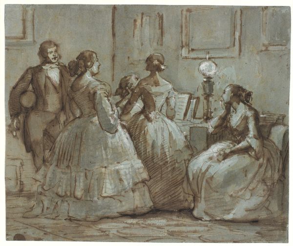 This watercolor, "Harpsichord Recital at Count Rumford's, Concord, New Hampshire," was made in the late 18th or early 19th century by Benjamin Thompson, also known as Count Rumford. It is a domestic scene portraying women playing music and socializing. Thompson, born in colonial Massachusetts, lived a life marked by shifting loyalties, eventually becoming a Count in Bavaria. Here, we see a snapshot of elite social life during the early Federal period in America. The emphasis on women's domestic accomplishments, such as musical performance, speaks volumes about gendered expectations and social standing. The figures are stiff, yet there’s a sense of burgeoning femininity in their elaborate dresses and hats. Consider the untold narratives: what of the enslaved people who likely maintained such a household? What aspirations might these women have held beyond their expected roles? This piece becomes more than just a drawing; it reflects complex social dynamics.