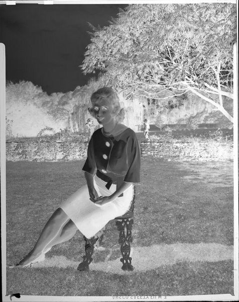 Editor: This photograph by Lucian and Mary Brown captures a young girl in a bikini, seemingly in her yard. It’s quite striking because it’s a negative, making the scene feel almost ghostly. What social narratives do you think are at play here? Curator: This image, even without a specific date, brings up a lot about the historical context of childhood and innocence. The girl's pose and attire reflect evolving cultural attitudes toward youth and sexuality. How do you think the choice to present it as a negative impacts our perception of her? Editor: It feels almost like an x-ray, exposing something vulnerable. The traditional view of children in art is innocence, and this photo challenges that in a way. Curator: Precisely. Consider how the domestic setting further complicates this. It prompts us to question the power dynamics within families and the ways in which the private sphere can become a site of public scrutiny. Editor: So, it's not just about the girl, but about the society observing her? Curator: Exactly. It's a reminder that even seemingly innocent images can carry complex layers of meaning, reflecting broader social norms and anxieties. Editor: That's a powerful way to look at it. Thanks!