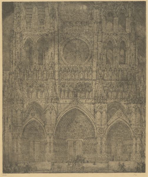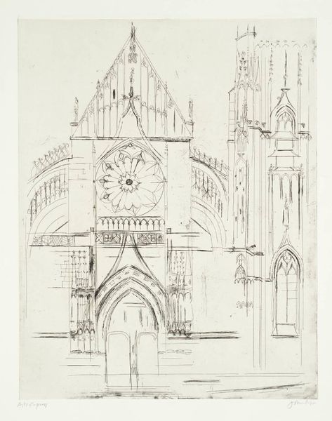 Curator: Here we have Friedrich Maximilian Hessemer's "Santa Croce in Florence," created as an etching, dating from 1827. Editor: It feels hushed, almost a memory. The lines are so delicate, barely there. A ghost of a building, shimmering into being. Curator: Indeed. Note the linear precision characteristic of etchings at the time. Hessemer employs line work meticulously to represent the scale and mass of the architecture. It's less about romanticising Florence and more about documenting it, using a reproducible method. Editor: But there’s a softness, despite the precision. It's not just a technical drawing. It makes you want to run your fingers along those stones. Curator: That speaks to the layering process itself. Consider the multiple passes of the etching needle and the immersion of the plate in acid. This act is very process oriented. Editor: All that work...yet it seems so effortless. You feel the weight, the history of Santa Croce. Did Hessemer experience something in Florence he translated in his image? Curator: Hard to say for certain. But remember, travel became more accessible during the 19th century, fostering interest in and demand for images of architecture and landscape, and etching was a cheap way to make them. The marketplace was demanding a specific type of souvenir. Editor: Still, even with the forces of the market in play, an artist can't help but infuse some part of their experience, don't you think? The very choice of this angle, that light... It feels deeply personal, rather than just commercial. Curator: The fact it exists as an etching, that's something any buyer of any budget could potentially acquire. That accessibility is interesting from a materialist point of view, because it suggests the architecture of Santa Croce wasn't reserved for elite viewership only. Editor: Maybe. But, personally, I’ll take my cue from the light, from how Santa Croce almost vibrates on the page... It invites introspection. Curator: Well, this piece certainly offers us a perspective into 19th-century modes of artistic production. Editor: And a glimpse of beauty rendered in delicate lines, whatever the circumstances.