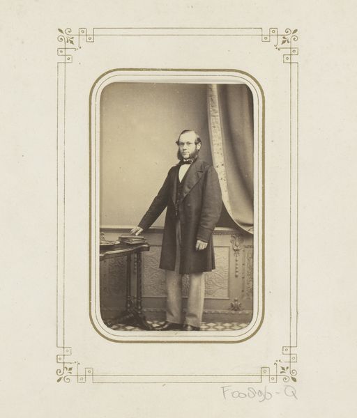 Editor: Here we have "Portret van Bastiaan de Greef staand bij een tafel," taken sometime between 1864 and 1879 by Leonard de Koningh. It’s an albumen print, giving it this wonderfully sepia, old-world feel. The man himself looks quite serious, almost as if he is acting for posterity! What draws your eye when you look at this photograph? Curator: Oh, you’re right; he *is* posing for eternity, isn't he? For me, it’s the light. See how it sculpts his face, particularly around the brow? Makes him look like a Roman bust unearthed from centuries past! And that little flick of shadow under his cheek – masterful. It’s odd how staged photographs from that period now radiate something almost alien to our contemporary candid sensibilities. Have you felt that? Editor: Absolutely! There’s a deliberate artificiality, and, honestly, something strangely touching about it. The way they curated their own image. Almost theatrical. But where do you think the realism comes in? Curator: Good question. Despite the posed nature, it’s brutally honest. There’s no airbrushing, no digital magic, just him, standing there with all his imperfections – you can almost feel his nervousness and resolve mixed together. We're not just looking at de Greef; we are contemplating our strange urge to stop the clock! And I always enjoy pondering the photographer's part too: were they friends, rivals, lovers, or strangers? Each encounter could change everything... Editor: It’s a far cry from a modern selfie! I hadn't considered all the complex social possibilities. Thinking about this makes me reconsider those studio portraits with a renewed appreciation for a specific type of performance. Thanks! Curator: My pleasure! Photography is a funny old mirror, and thinking about how that reflection ripples across time helps make sense of what has been left behind.
