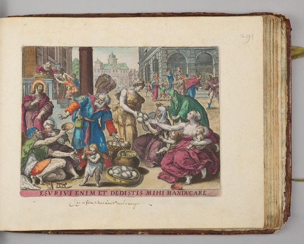 Curator: This is Johann Sadeler I's engraving, "The Adoration of the Magi." Editor: The composition feels quite dense, almost claustrophobic. But the colors! That vibrant orange draws the eye immediately. Curator: These prints circulated widely, shaping perceptions of biblical scenes and reinforcing social hierarchies. Note the magi, representing different continents, acknowledging Christ's universal authority. Editor: It's interesting how Sadeler uses line to create texture and depth, particularly in the drapery. It's not just about representation, but also about the expressive quality of the medium itself. Curator: This print also reflects the Counter-Reformation's emphasis on the sacraments, with the magi's gifts symbolizing Christ's roles as king, priest, and prophet. It’s a direct link to ritual and power. Editor: Seeing it now, I'm struck by how the dynamic arrangement contributes to its complexity, a testament to Sadeler's skillful manipulation of form. Curator: Indeed. It's a fascinating glimpse into art's role in shaping religious and social identities during that time. Editor: A rich work, offering so much to consider visually and contextually.