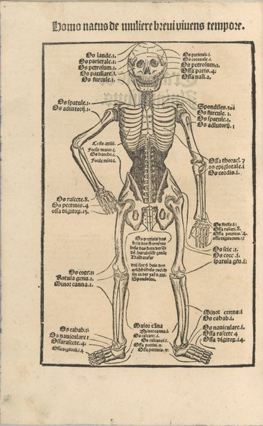 Curator: This engraving, dating between 1688 and 1698, comes from José García Hidalgo’s book 'Principios para estudiar el Nobilíssimo y Real arte de la Pintura'. Titled “Studies of three skeletons,” it reflects the artistic interests of the period, now residing at the Metropolitan Museum of Art. Editor: Whoa, immediate first impression? Memento mori central! A little bit dark, a little bit humorous… and unexpectedly graceful. I’m drawn to that figure in the middle – half flayed, half… presentable? Curator: Indeed, it presents a very clear, Baroque sensibility that is tied to the historical obsession with vanity, allegory and our place in life and, of course, in death. The composition offers a very direct reading of how the ephemeral human beauty of flesh is ultimately destined to bone. We see in Hidalgo’s art here a tension between aesthetic beauty, figuration and our decaying flesh. Editor: You put it so perfectly. I see almost a celebration too? These aren’t scary skeletons; they're posed, almost elegant, doing the "before and after" comparison of time. That middle figure has a calmness, accepting the shared destiny, which transcends just horror and despair to find dignity in our shared vulnerability. Curator: That middle figure does act as something of an objective 'truth', which then enables those outer skeleton figures to become symbolic representations. This reminds me of certain debates at the time surrounding identity, the physical form, and how it impacts our lives. How should it be portrayed in art? Is a beautiful body automatically worthy of the viewer’s gaze if its truth will inevitably be as horrifying and naked as a skeleton? It challenges conventional assumptions in representation by asking if beauty lies beneath the surface in bone structure or in lived reality within flesh, prompting introspection from contemporary viewers, I hope! Editor: And that final, drooping skeleton almost reminds me of those renaissance artistic renditions of sadness and suffering. The scythe also adds this narrative touch to the entire artwork, allowing it to go beyond simple study material to an artwork in and of itself! Looking at art with this specific lens gives such depth and humanity to figures otherwise portrayed with little emotion. A true balancing act in Baroque illustration! Curator: Precisely. Looking at it this way allows us to reflect on both artistic intentions, and where the work stands now, socially and artistically. Editor: Gives a lot to ponder next time I'm face to face with my own mortality! A beautifully complex artwork.