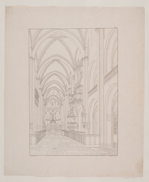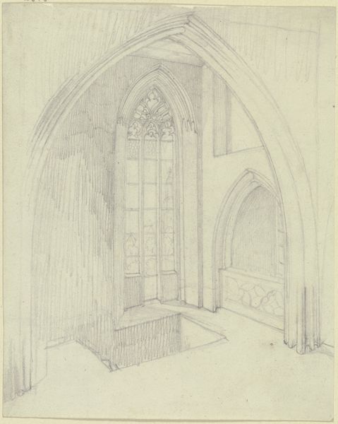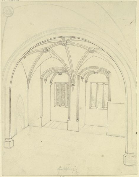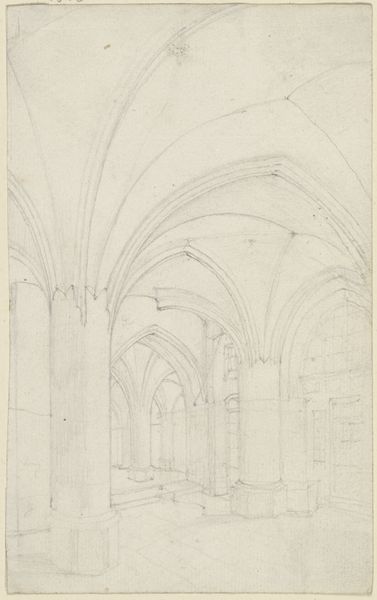 Curator: Karl Ballenberger's architectural drawing, "Mortuarium in der Klosterkirche Heilsbronn," captures the interior of a monastery church using pencil and ink on paper. Editor: My initial feeling? An emptiness. A haunting stillness. It’s as though the soul has departed and we are left with the bones, the skeleton, of faith itself. Curator: Well, these drawings, common in the 19th century, served not only as records but often as instruments within broader debates about architectural preservation and religious identity. Editor: Absolutely! But there is a feeling here. Look at the geometric precision—the vaulted ceilings, the rows of pillars fading into the background—it's all rendered with this almost ghostly touch, very cold feeling, like a blueprint for a dream, or a forgotten history. Curator: Exactly. Ballenberger uses the architectural details to showcase the ambition of the Gothic style and perhaps also speaks to its later state of decay, while reviving a sense of past cultural values. Editor: Right, and the windows, letting in practically no light... or rather, a pale, spectral light... Are these supposed to inspire awe or perhaps lament, some feeling of deep sadness and the stark, unadorned stonework feels oddly purifying, very austere? Curator: It is interesting to consider whether Ballenberger intentionally invites the observer to see past grandeur intertwined with a critical reflection on religious and architectural authority in his period. The drawing's starkness is purposeful. Editor: I love the conversation this piece sparks, about what has departed and what remains when time marches through these grand spaces, all that geometrical beauty with faint echoes. Curator: For me, Ballenberger has crafted a compelling vision, making the old speak in new dialogues concerning value and endurance in a changing world. Editor: Ultimately it becomes an inquiry into human spirit, rendered with beautiful architectural geometry; it is deeply haunting.