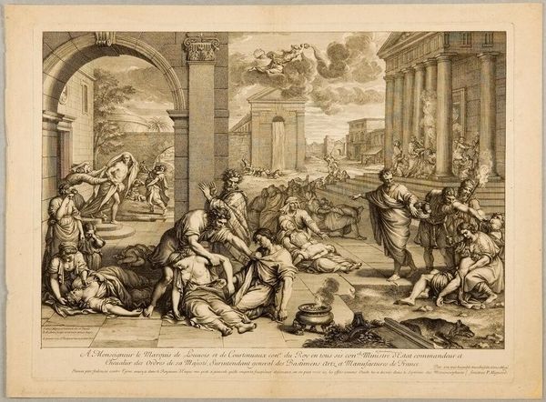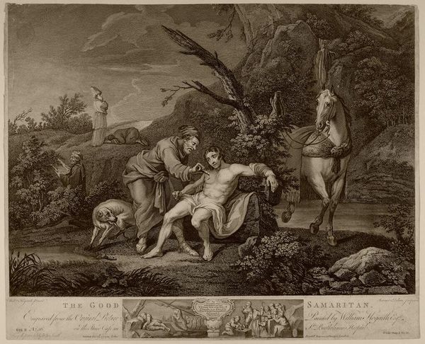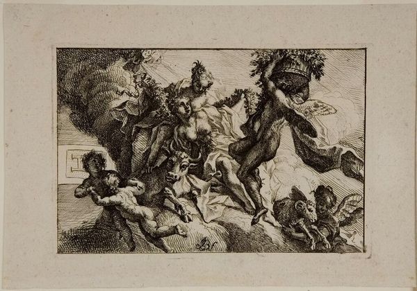Editor: This is Francis Lamb's "Meleager and Atalanta," likely created in the late 18th or early 19th century. It depicts a chaotic hunt scene. What cultural echoes do you see in this image? Curator: The Calydonian Boar hunt is a recurring motif representing the struggle to impose order on the wild. Notice how Atalanta, a huntress, is depicted actively participating. Does that not challenge conventional ideas of gender roles during that period? Editor: That’s fascinating! I hadn't considered the symbolism of Atalanta's presence in that light. Curator: This challenges the traditional heroic narrative, layering in a commentary on societal expectations and the power dynamics in the hunt and beyond. It’s a potent display of human will against untamed forces, both literal and metaphorical. Editor: I see how the visual symbols convey deeper cultural meanings that connect across time. Curator: Indeed, these images transmit values and challenge norms, revealing the enduring power of visual storytelling.