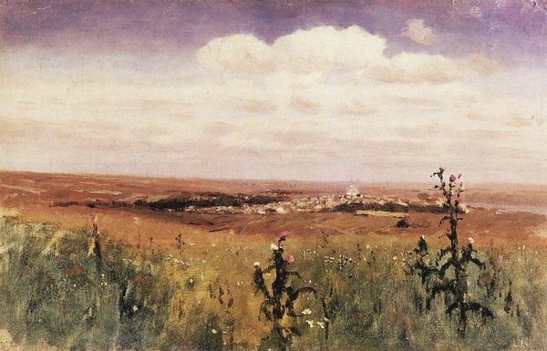 Arkhyp Kuindzhi’s "View on Moscow from Sparrow Hills" is rendered in oil paint, a medium that allows for layering and blending to achieve subtle atmospheric effects. Kuindzhi wasn’t interested in a high degree of finish. You can see that the texture of the paint is quite loose, particularly in the foreground, giving a sense of immediacy. The application of paint varies, from thin washes in the sky to thicker impasto in the foliage, creating depth and dimension. This textured, almost rough handling of materials, combined with the panoramic vista, imbues the painting with a sense of the vast Russian landscape. The bright verdant green of the fields speaks to the agricultural life that was the base of Russia's economy at the time. But the distant view of Moscow hints at the industrialized future, with its cost in human labor. By appreciating how the material qualities of oil paint are used here, we can better understand the social and cultural values that Kuindzhi sought to express, blurring the line between pure landscape and social commentary.