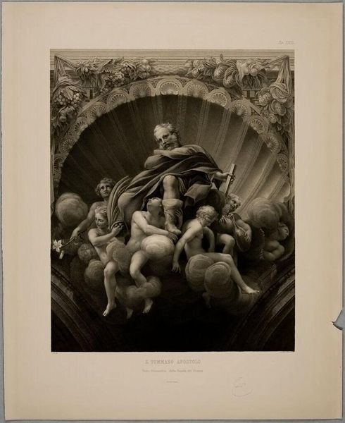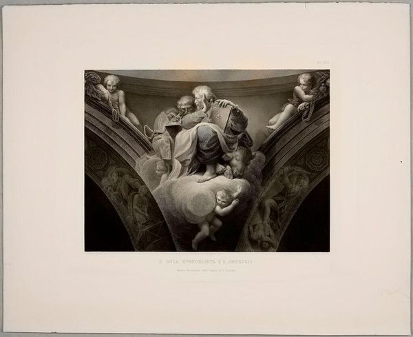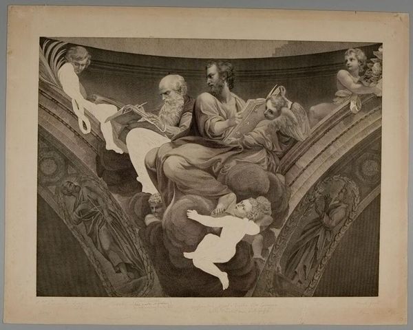 Editor: This is Paolo Toschi's "Saint Mark the Evangelist and Saint Gregory." I'm struck by how these figures are seemingly floating, surrounded by cherubs. What can you tell me about the symbolism at play here? Curator: Consider the lion, Mark's traditional attribute, a symbol of courage and royalty. It’s juxtaposed with Gregory, often depicted with a dove, representing divine inspiration. Do you see how these symbols ground the figures in a specific narrative? Editor: It's fascinating how these symbols, seemingly simple, carry so much historical and cultural weight. Curator: Precisely! And notice how the upward gaze of the figures suggests a connection to the divine, reinforcing the painting’s spiritual message and reminding us of the enduring power of visual language. Editor: I hadn't noticed that before. Thanks for pointing that out! Curator: My pleasure. It’s amazing how much these images can still communicate to us.