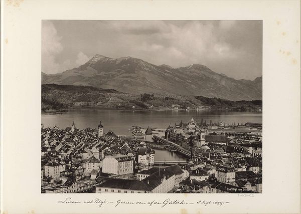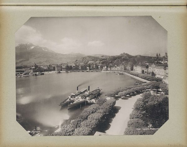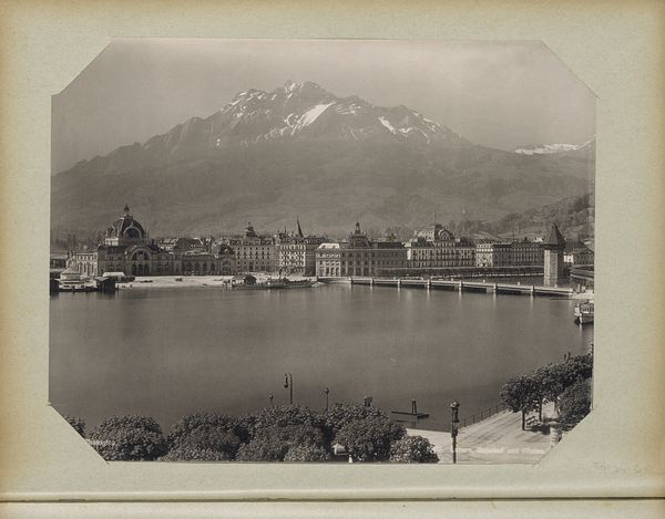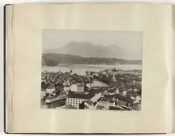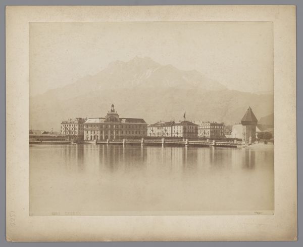 Editor: This is "Gezicht op de Kapelbrug te Luzern" by Giorgio Sommer, made before 1895. It’s an albumen print photograph housed here at the Rijksmuseum. It’s really serene… almost too still. What's your read on it? Curator: The stillness you perceive points to a particular kind of engagement between photography, tourism, and the construction of national identity in the late 19th century. The Kapelbrug, or Chapel Bridge, was, and still is, a major tourist attraction. Sommer's photograph, reproduced and sold widely as a souvenir, played a role in defining Switzerland as a picturesque, almost timeless, destination. What kind of social function do you think these images performed? Editor: Hmm, so it’s more than just a pretty picture, it's nation-building, almost? By showcasing these postcard-perfect scenes, it’s reinforcing an ideal of Swiss identity for both tourists and the Swiss themselves. It's interesting that it’s labeled "historical photography" in the museum’s metadata. Does it mean that now we can use this work to look into its contemporary socio-political context? Curator: Precisely! The "historical" aspect invites us to consider how the image participated in shaping cultural narratives and power structures. The choice to depict the bridge without visible human activity further contributes to this sense of timelessness, which erases the complexities of daily life and potentially idealizes the nation’s image. Editor: I see your point. It’s kind of like a stage set waiting for actors who never arrive, cementing this idea of Switzerland. I will never be able to see a picture from this time without this lens again. Thanks. Curator: Exactly. Now consider how institutions like museums, by displaying and categorizing works, contribute to this ongoing process of constructing meaning and historical narrative. It's all intertwined, isn’t it?
