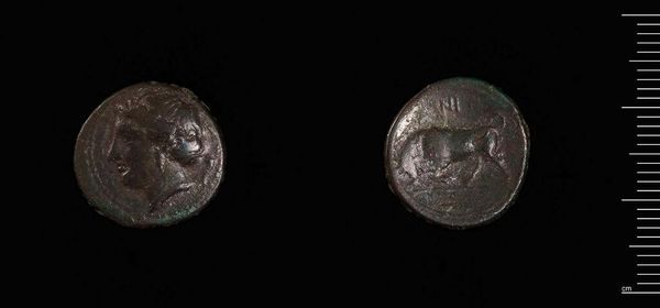Curator: This is a coin attributed to Agathokles, Tyrant of Syracuse, currently held in the Harvard Art Museums collection, weighing 9.58 grams. Editor: It feels immediately weighty, not just physically but historically. The patina suggests centuries of circulation and exchange, both economic and cultural. Curator: Precisely. Note the composition: the profile of a ruler on one side, balanced by a symbolic animal on the other. The incuse details and circular format are visually compelling. Editor: But whose power did this coin serve? Currency is never neutral. Minting these coins served to legitimize Agathokles's often brutal rule, extending his reach into everyday lives. Curator: Agreed, and yet, within the minimalist design, the artist has created a fascinating system of symbolic representation. It’s a delicate balance of power and artistry. Editor: It's a potent reminder that even the smallest objects carry within them larger narratives of power, identity, and the social structures of their time. Curator: Indeed, examining the formal qualities of the coin gives insights, though incomplete without broader historical contextualization.