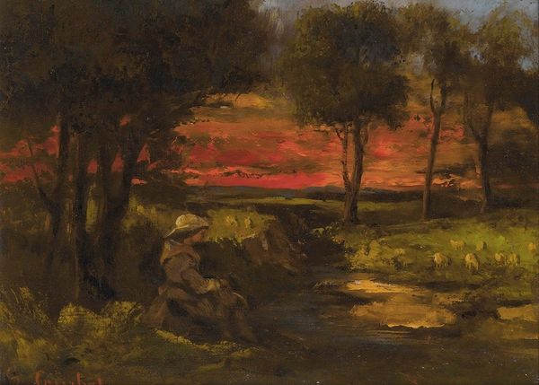 Editor: So, this is John William Inchbold's "Recollection. Barden Fells." It's quite small, painted on what looks like a thin support. I'm struck by how the sunset's colours reflect in the water, almost obscuring the landscape. What's your take on it? Curator: Considering Inchbold’s historical context, it's vital to examine the economic forces driving landscape painting at the time. Was he responding to the increasing industrialization of Britain by depicting an idealized rural scene, a commodity for an urban consumer? And how does the scale influence our understanding of its purpose? Editor: That's a good point. The small size does suggest it could be something for personal contemplation or display, rather than a grand statement. Curator: Exactly. The materiality of the painting, the very pigments he chose and how they were applied, speaks to a specific process. Consider the rapid brushstrokes versus the scene depicted. Are they at odds? Editor: I never thought about it that way. So, by looking at the materials, we can see how it reflects the context of the time? Curator: Precisely! Examining the piece through its production reveals much about its relationship to society.