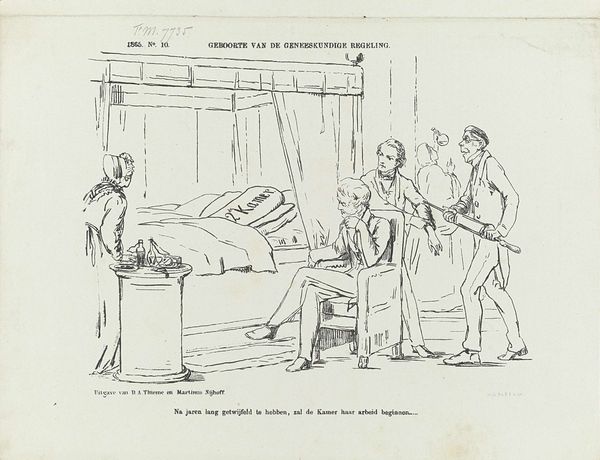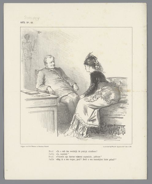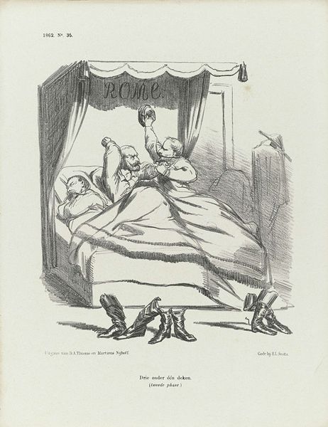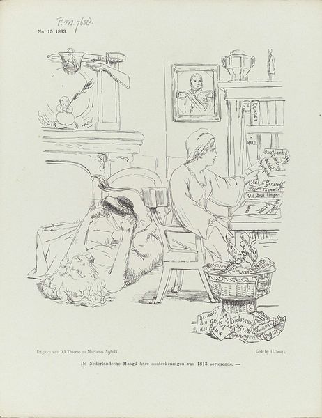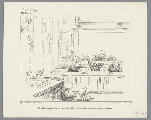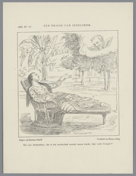 Curator: This lithograph from 1884, titled “Spotprent met een sociaaldemocraat,” or roughly, "Cartoon with a Social Democrat", is by Johan Michaël Schmidt Crans. Editor: It’s visually striking. The line work is incredibly detailed, almost frantic, which contributes to the satirical tone. The subject lounges rather decadently, amidst luxurious trappings... Curator: Exactly. Look at the deliberate contrast between the text below the image and the man’s posture. The inscription is a supposed quote, lamenting that his father, and presumably he, *has* capital and that society *must* change. The scene critiques a particular brand of social democrat – those perhaps hypocritically benefiting from the system they critique. Editor: It highlights the complicated and often contradictory nature of advocating for change. He lounges there smoking his cigar in obvious comfort, and you just can't miss the details--the elaborate vase and ornate table--it really underscores his privileged position. Curator: And there’s a deeper cultural critique here, if you ask me. It is about challenging who has access to the vocabulary and rhetoric of social justice. We should analyze his race, class and gender within late 19th century European society... considering whose voices are being centered in progressive movements. Editor: You raise such key questions here, in terms of representation and historical context. The Dutch Golden Age stylistic influence—blended, rather subversively, with realism and comic art—creates a sort of tension as well, I would suggest, and highlights the ways historical art movements are manipulated for political and social messaging. Curator: I find the artist's ability to evoke emotion through a deceptively simple scene powerful. The subject is unsympathetic, to put it mildly. Editor: Absolutely, and the use of caricature amplifies this sentiment. By exaggerating features and emphasizing luxury, the artist encourages viewers to question the man’s sincerity. The artist’s choice of a print—traditionally associated with mass dissemination—suggests this critique was intended for a broad audience. Curator: Precisely. We need to consider how the imagery might reinforce or challenge social hierarchies within a shifting socio-political landscape. Editor: Agreed. This lithograph speaks volumes about power, hypocrisy, and the complexities embedded within social movements. Curator: A biting commentary that continues to resonate even today, I think.