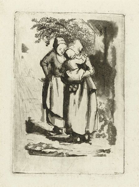 Curator: This engraving, attributed to Antonio Morghen and created sometime between 1798 and 1853, is titled "Vrouw met slapend kind op de rug, bij steen gezeten," or "Woman with sleeping child on her back, sitting by a stone." Editor: There's such a quiet exhaustion about her, a real sense of the weight she carries, literally and figuratively. You can feel it in the stoop of her shoulders and in those bare feet on the rough ground. Curator: Absolutely. The artist employs a rather limited palette, characteristic of engravings, yet skillfully manipulates light and shadow to create depth and volume. Notice how the stark white of the stone contrasts against the woman's darker clothing, drawing the eye directly to that compositional anchor. The lines are economic but incredibly descriptive, wouldn’t you agree? Editor: Yes, the lines denote so much detail about her material circumstances. The print’s sharp, unwavering lines create a narrative around labor and resilience. Observe her worn clothes and the mundane objects, perhaps water gourds, affixed to the bundle that also carries her child—they speak volumes about daily survival and are testaments to the everyday. I wonder, was this image mass-produced for a broad consumer base, offering a glimpse into the lives of working women for those more affluent? Curator: It’s highly plausible. And thinking about the woman's gaze, cast downwards, there’s a subtle asymmetry in the composition—the child nestled on her back serves as a counterweight, a balance between burden and blessing. A fascinating formal construction, don't you think? Editor: Definitely. Thinking of it as “genre-painting” brings context too, doesn’t it? I imagine her making a grueling journey with the resources and limitations of that time. Considering all of these things – it gives depth to the visual form that your approach isolates, perhaps? Curator: A valid point; integrating societal implications refines the narrative the image presents. I see a dialogue created through art with history that is undeniable. Editor: Yes. Her bowed figure makes me grateful for what I have and pensive about the labor so many others perform to merely exist. Curator: For me, it reaffirms the potential of engraving, of any medium really, to transcend its materiality and invoke profoundly human experiences.