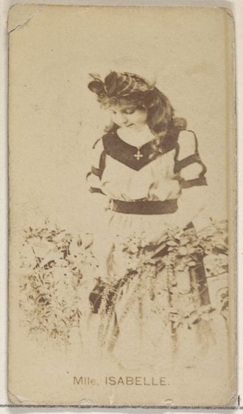 This small photograph, part of a series by W. Duke, Sons & Co. from around 1900, captures an actress seated and gazing downward. The sepia tone imbues the image with a nostalgic quality, highlighting the textures of her elaborate costume. The composition is carefully structured, positioning the actress centrally, with her voluminous dress filling much of the frame. The soft focus and muted tones create a sense of depth, drawing the viewer's eye towards the subtle details of her attire. The dress, a complex layering of ruffles and lace, acts as a signifier of theatricality and artifice. This is a carefully constructed image, designed to present a particular image of femininity and performance. The actress's downward gaze adds to the sense of introspection, inviting viewers to contemplate the relationship between public persona and private self. This tension between appearance and reality is a recurring theme in performance studies and speaks to broader cultural anxieties about authenticity and representation.
