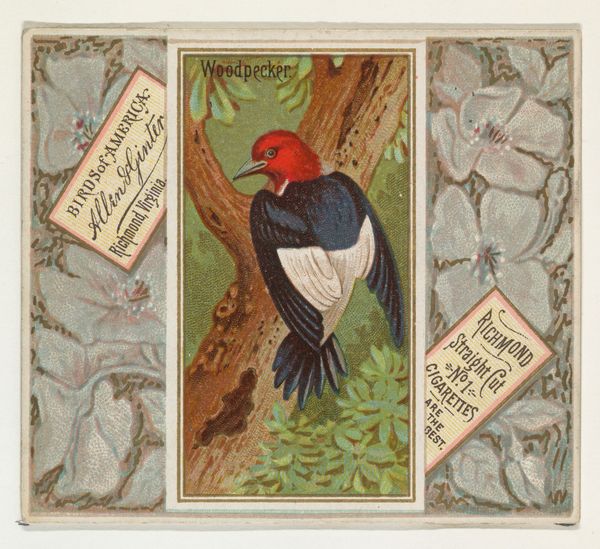 Editor: So, here we have *Raven* from the Birds of America series by Allen & Ginter, a lithograph from 1888. I am immediately struck by how this image, while appearing very composed and even, dares to suggest that birds in ads could capture a strange melancholic mood. What are your thoughts on this piece? Curator: It's interesting that you pick up on the melancholy. For me, it's less sorrowful and more about a feeling of potent solitude. Ravens are observers, perched on the edge of things, and there's something profound in how Allen & Ginter capture that. See how the gold background flattens the perspective? This enhances a stylized composition akin to Ukiyo-e prints, drawing the viewer into a more symbolic space than realistic one. The raven isn't just a bird here. It’s an idea, almost a logo. And that, juxtaposed with the cigarette branding, does create a tension... doesn't it? Editor: Absolutely! The ad almost elevates the image of a bird to something mythological, a far cry from everyday advertisement. Does this elevation give this art its peculiar magnetism? Curator: I think so, but it's also about the visual language of the time. This blend of fine art sensibility with commercial intent is fascinating because it suggests an attempt to create an allure – one that’s both sophisticated and directly tied to consumption. Did you notice how this approach resembles art nouveau? Editor: Yes, I now see a dialogue between advertising and pure artistry in that period. Curator: Exactly, this fusion gives pieces like *Raven* an enduring charm, hinting at a world where even cigarettes aspire to beauty and artistic sensibility. Editor: This was surprisingly insightful, merging commerce with the aesthetic language. I certainly see it with different eyes now. Thanks so much for your reflections.