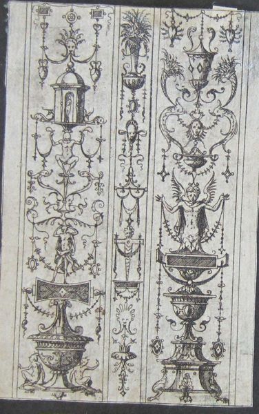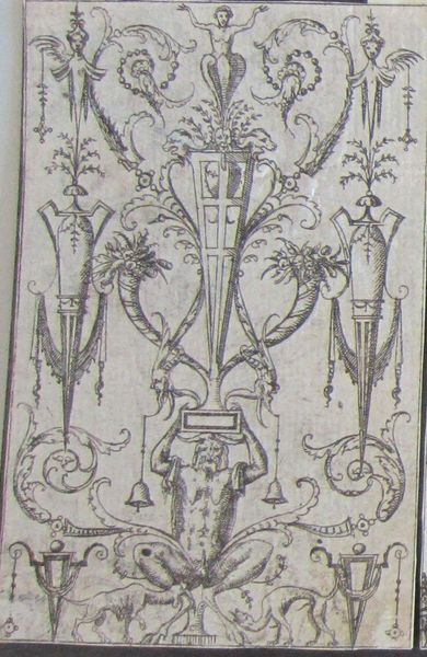 Editor: This intricate engraving, "Grotesque with the Scene of Two Warriors Confronting Four Men, Music Making Figures Below," is by Jacques Androuet Du Cerceau. It's teeming with fantastical creatures and symbols. What do you see as the key symbolic elements at play? Curator: Notice how the grotesque figures, half-human and half-animal, are interwoven with scenes of conflict and music. This juxtaposition speaks to the Renaissance fascination with the interplay between order and chaos, beauty and the monstrous. Editor: So, the grotesque isn't just about being ugly? Curator: Not at all! It's a potent symbol of transformation, of the boundaries between worlds blurring. The warriors, the music, the hybrid creatures – they all contribute to a complex visual language. How does this symbolism resonate with you? Editor: I guess it shows how interconnected everything is, even opposites. It makes me think about hidden meanings. Curator: Precisely. The image becomes a kind of memory palace, rich with cultural echoes and enduring psychological themes.