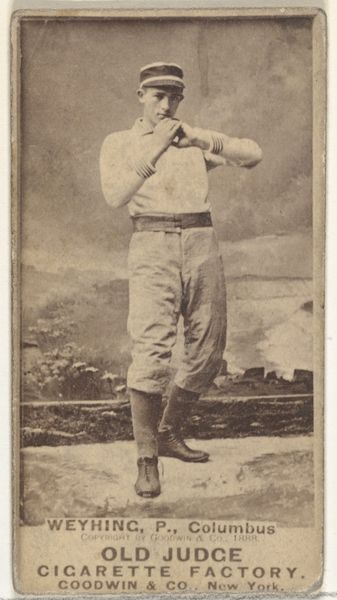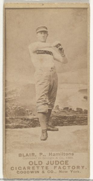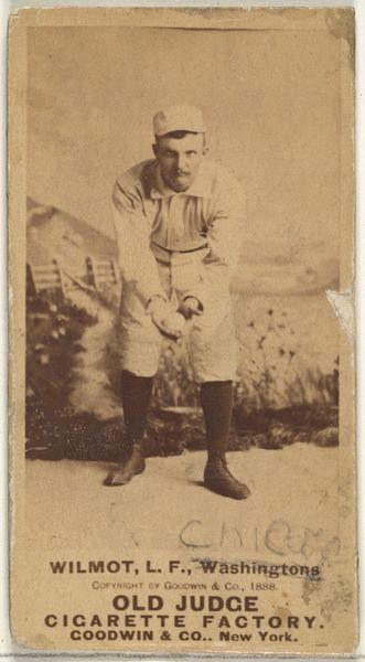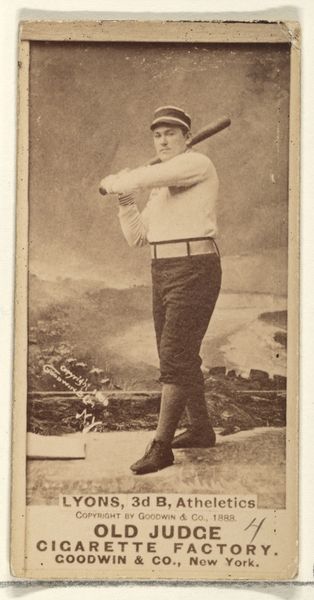 Curator: This is a baseball card featuring Bierbauer, the 2nd Baseman for the Philadelphia Athletics, part of the "Old Judge" series from 1888, made by Goodwin & Company. It's fascinating as a really early example of sports-related marketing using photography. Editor: It feels wonderfully sepia-toned and vintage. Something about that blurry background creates this wistful sense, like peering into the past... almost ghostly! Curator: Exactly! It's more than just a portrait; it's a material document reflecting the convergence of sport, celebrity, and commercial culture at that moment in American history. The paper itself and the printing techniques— Editor: You're reminding me—these were cigarette cards, right? A premium attached to the pleasures of smoking! Imagine collecting them now... a rather different cultural context. Curator: Precisely! And thinking about the workers, mostly women and children, in these cigarette factories who processed the tobacco and assembled the cards—they are part of the unseen material conditions which gave us Bierbauer in sepia tones. The photograph itself, mass-produced and disseminated, becomes this artifact infused with a particular labor history. Editor: Looking closer at Bierbauer himself—there’s an endearing stiffness. He's almost doll-like with that gaze. There's something profoundly human, captured within that rigid pose, almost innocent. Curator: It captures the period’s evolving relationship between performance, commodity, and self-image too. These cards weren't just advertisements; they contributed to shaping the mythology around baseball heroes. Think about the scarcity, preservation and the act of collecting as ways that turn a commercial object into something sacred. Editor: Right, a secular relic. This tiny portrait holds all those layers... industry, fandom, and fleeting moments. It's making me think of the fragility of fame and the surprising ways images endure and speak to us across time. Curator: I hadn't thought about Bierbauer’s humanity amid baseball hero mythologizing in quite that way. Fascinating to trace a moment when individual spirit encounters such immense, almost industrialized production of imagery!