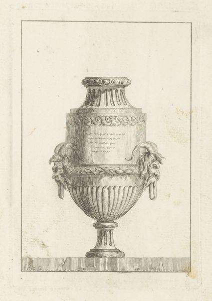 Juste Nathan Boucher created this drawing of a vase with garlands in the 18th century using etching and possibly some engraving techniques. The dense cross-hatching and fine lines create the illusion of three-dimensionality, highlighting the form, texture, and ornamentation of the vase. The image is not just a representation, but an exploration of technique. The way the lines are etched affects how the light interacts with the surface, implying the material qualities of the vase itself, and its intended purpose. Given its intricacy, this drawing most likely served as a template for other artisans, a pattern from which to produce actual three-dimensional objects. This speaks to the rich cross-fertilization of the fine and decorative arts at this time. The drawing provides insight into the broader context of design, production, and consumption in 18th-century Europe, and how the division of labor creates an entire social world.